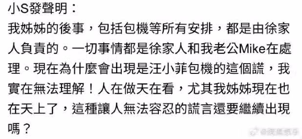 小S也是憤怒至極,證實「一切事情都是徐家人和我老公Mike在處理」。