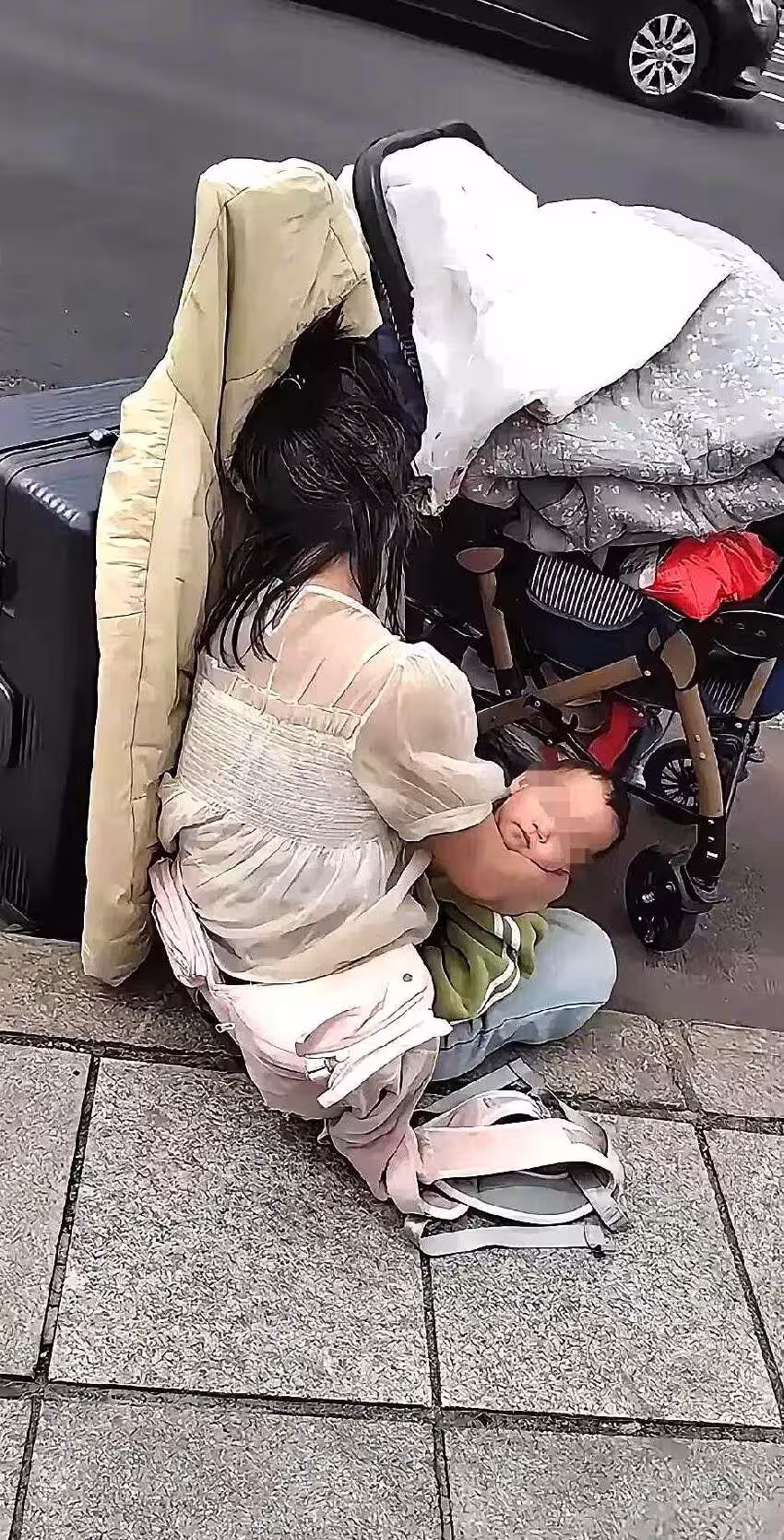 她蹲在地上,額頭抵著孩子的小腦袋,似乎用盡氣不讓自己倒下。