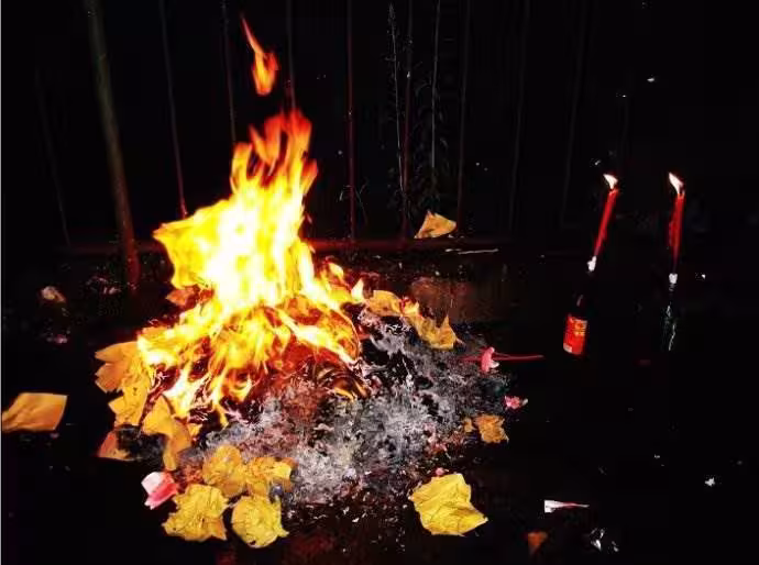 步驟2:焚燒過程點燃後待火苗穩定,手持未燃部分清晰說出:「(稱謂)收錢」,例如「爺爺收錢」。