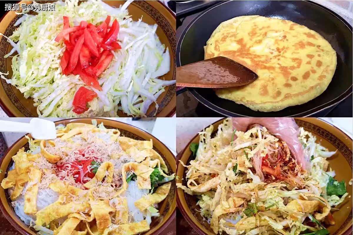 5. 最後撒上點香菜段點綴一下。這道菜顏色五彩斑斕,口感層次豐富,白菜心的脆、西紅柿的酸、蛋皮的香、粉絲的滑、蝦皮的鮮,混合著酸甜開胃的汁水,特別解膩,尤其是在吃了大魚大肉之後,來上這麼一盤,簡直太舒坦了!
