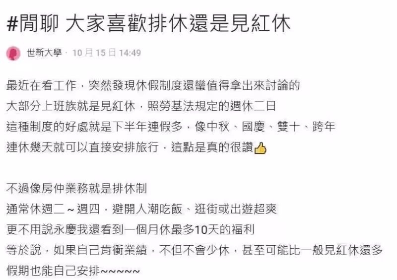 原PO在Dcard上指出,大部分上班族都是「見紅休」,除了勞基法規定的周休二日外,還有下半年許多國定連假如中秋、國慶、光復節,可以趁連假安排旅行出遊。而像房仲業務則是多「排休制」,自行彈性安排假期,避開人潮吃飯、逛街、出遊,有時候甚至可以連排10天出國旅遊。