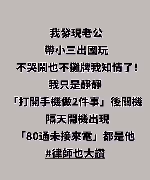 前陣子聽做律師的朋友陳姐說起一個案例,35歲的林小姐發現老公帶小三出國旅遊後,沒有哭鬧也沒有質問,而是冷靜地提前「處理信用卡和帳戶」 第二天早上,林小姐開機後,看到老公一夜之間打了80通未接來電,還有幾十條催她解鎖支付的訊息,她只淡淡回復了一句「我們談談離婚吧」,利落又清醒的處理方式,讓不少人佩服「這才是被背叛後該有的樣子,不委屈自己,不縱容錯誤」 接下來,就來看看她具體做了什麼吧!