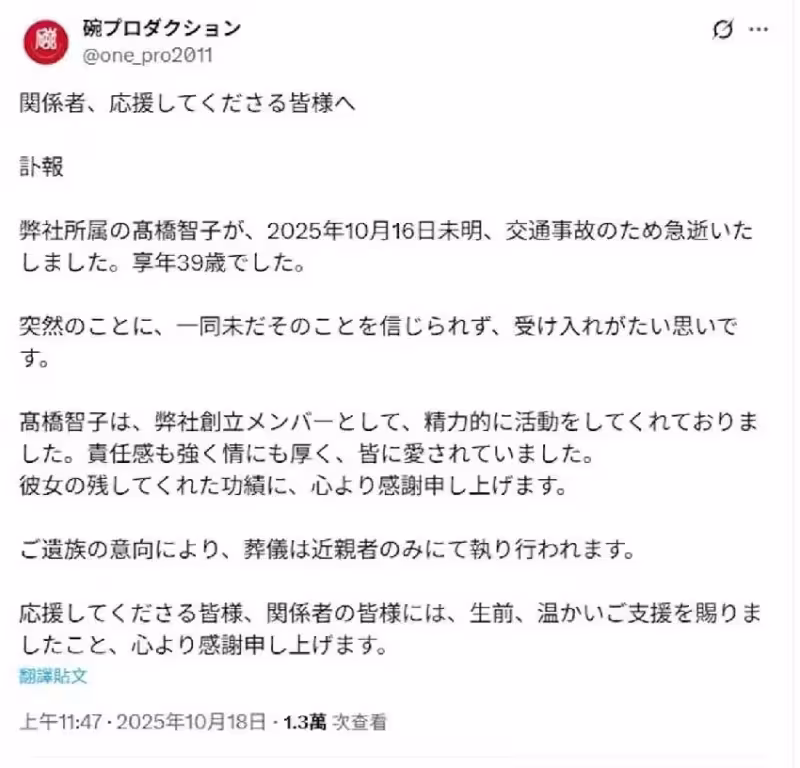 據日媒《每日新聞》於17日的報道,高橋智子在一場交通事故中離世,警方逮捕了38歲職業不詳的涉案人西潟一慶。