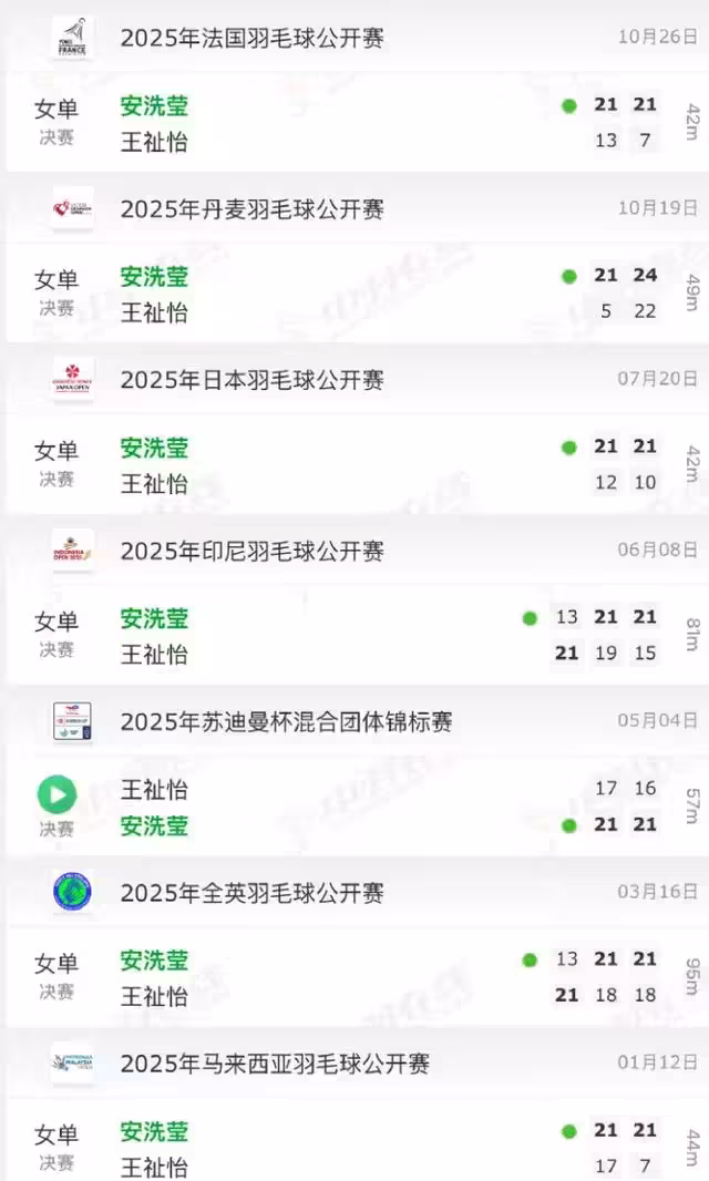 王祉怡目前面對安洗瑩是4勝15負,2025賽季是7連敗,這7場比賽我全部記錄了一下: