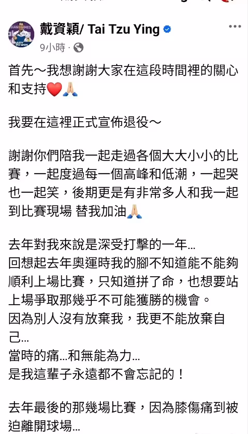 戴資穎的退役源於難以逆轉的傷病困擾。2024年巴黎奧運會上,她帶膝傷堅持參賽,賽後確診雙膝嚴重損傷,隨後經歷了左右膝手術及漫長復健。儘管在名醫周文毅的治療下恢復了活動能力,但競技狀態已無法重回巔峰。2025年中國公開賽首輪不敵丹麥選手雅各布森,成為她職業生涯的收官之戰。她在文中坦言,未能以理想方式結束生涯雖有遺憾,但傷病讓退役成為必然選擇。