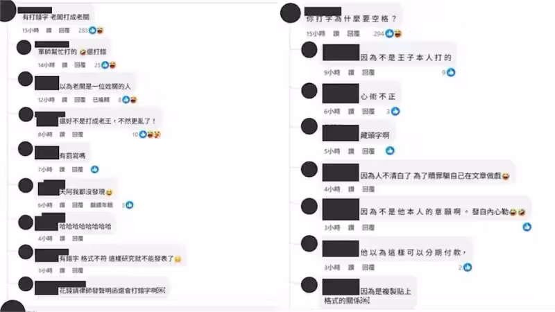 聲明曝光,部分網友稱讚王子負責,不過不少網友觀察出錯字和格式,狠酸「軍師幫忙打的,還打錯」、「有罰寫嗎?」、「有錢請律師收證網友對他不利言論,但是沒錢賠償?還是挺雙標的」、