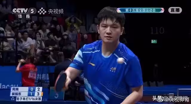 在全運會桌球男單1/16決賽,上海隊的樊振東戰勝河北隊的周雨,晉級男單16強,取得十五運開門紅。