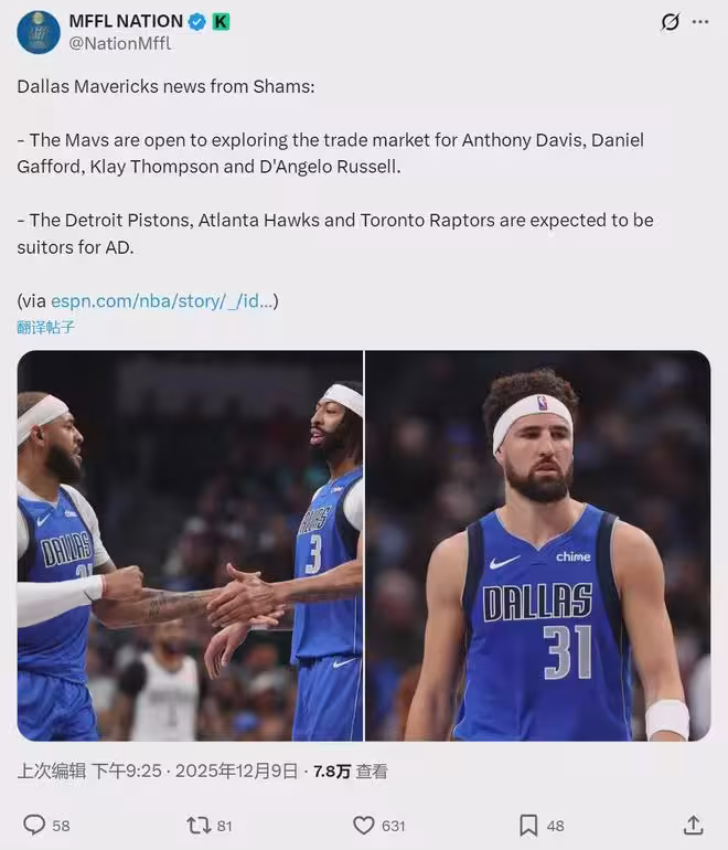 Shams接著表示:濃眉成為多支球隊的重要交易目標,其中包括東部的一些季後賽球隊。東部第1的活塞,東部第4的猛龍和東部第9的老鷹,都對濃眉非常感興趣。獨行俠的要價已經明確:年輕球員、選秀權、到期合同和角色球員。