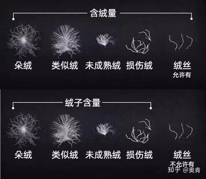 從下圖可以看出,從「含絨量」到「絨子含量」的改變,無疑對填充羽絨的品質要求更嚴格。舊標要求的「含絨量」包括絨子和絨絲,一些不法商家會在羽絨服裡填充很多絨絲廢料。表面看標籤寫著「含絨量90%」,等穿著時才發現,所謂的「高品質」羽絨服竟一點都不保暖。