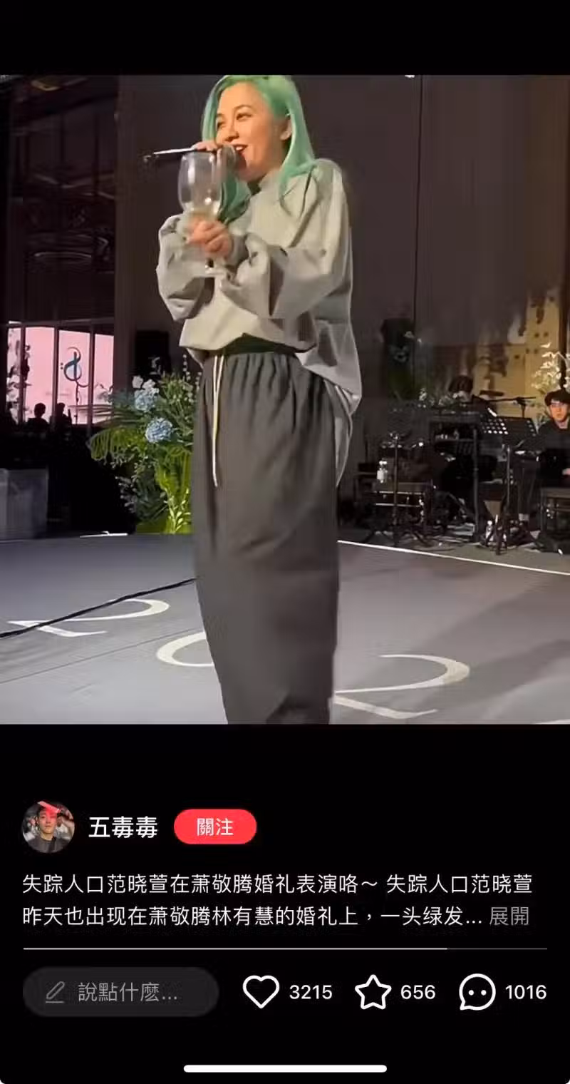 據《自由娛樂》報導,這位女星身穿灰色寬版上衣,打扮休閒,一頭綠藻色長髮特別吸睛,正是有「音樂小魔女」稱號的范曉萱,她淡出演藝圈多年,這次驚喜現身婚禮、難得獻唱,看起來玩得相當開心,