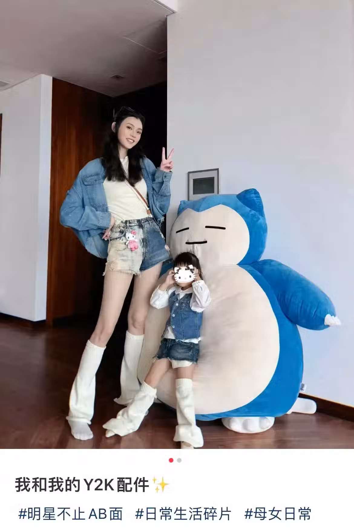 照片中,奚夢瑤身穿牛仔外套和牛仔短褲,搭配白色長筒襪,大秀長腿,一身打扮盡顯青春活力,少女感十足,完全看不出是兩個孩子的媽媽呀。女兒Romee扎著馬尾,身穿牛仔馬甲和牛仔短褲,搭配和媽媽同款的白色長筒襪,看起來甜美可愛。