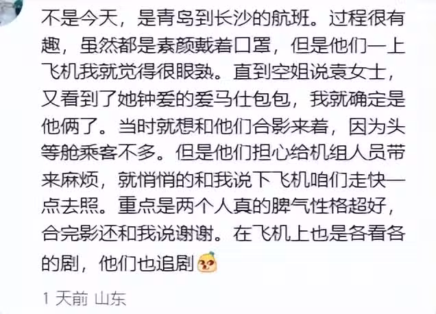 該網民見頭等艙人不多,想上前與二人合影,不過袁詠儀夫婦為了不打擾機組秩序,人非常貼心的給出建議:「悄悄的和我說下飛機咱們走快一點去照。重點是兩個人真的脾氣性格超好,合完影還和我說謝謝,在飛機上也是各看各的劇,他們也追劇。」