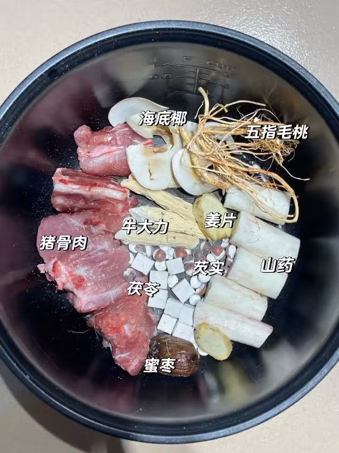 豬骨肉薑片料酒焯水洗乾淨,跟五指毛桃,牛大力,芡實,茯苓,蜜棗,薑片,山藥,海底椰一起煲一個半鍾,出鍋加鹽調味即可