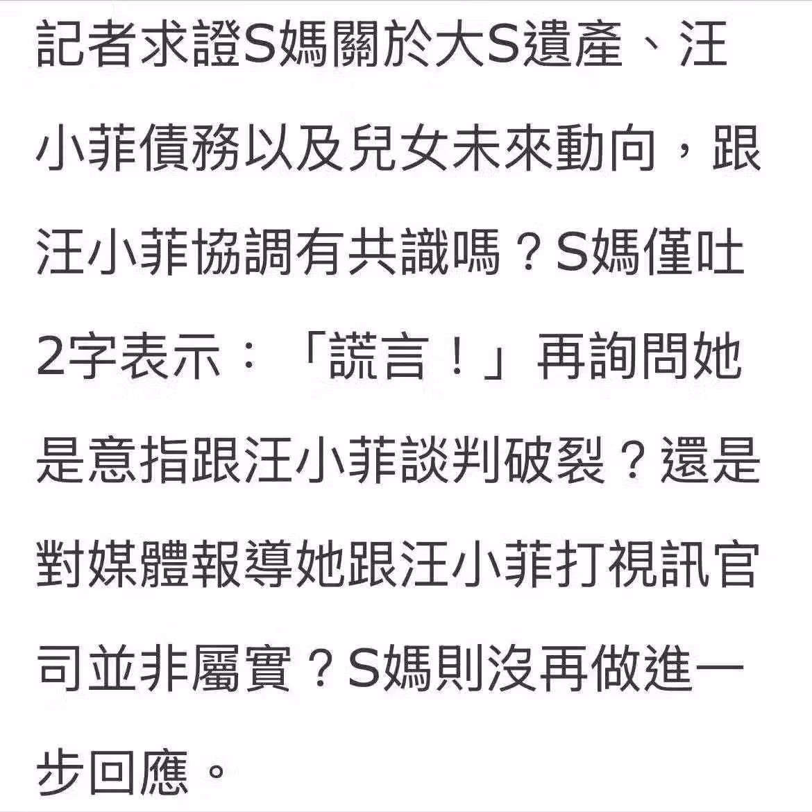 接著,S媽接受相熟媒體的專訪,言語間是要放棄爭奪撫養權、遺產,不再向汪小菲追討債務。