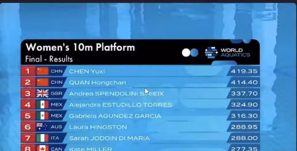 中國「最強雙子星」頻繁上演「水花消失術」,讓墨西哥的觀眾們頻頻發出驚呼和讚嘆,掌聲連連。陳芋汐獲得419.35分,全紅嬋獲得414.40分,可以說是斷層領先,而第三名英國選手斯潘多利尼-西里埃克斯的成績是337.70分,差距不小。