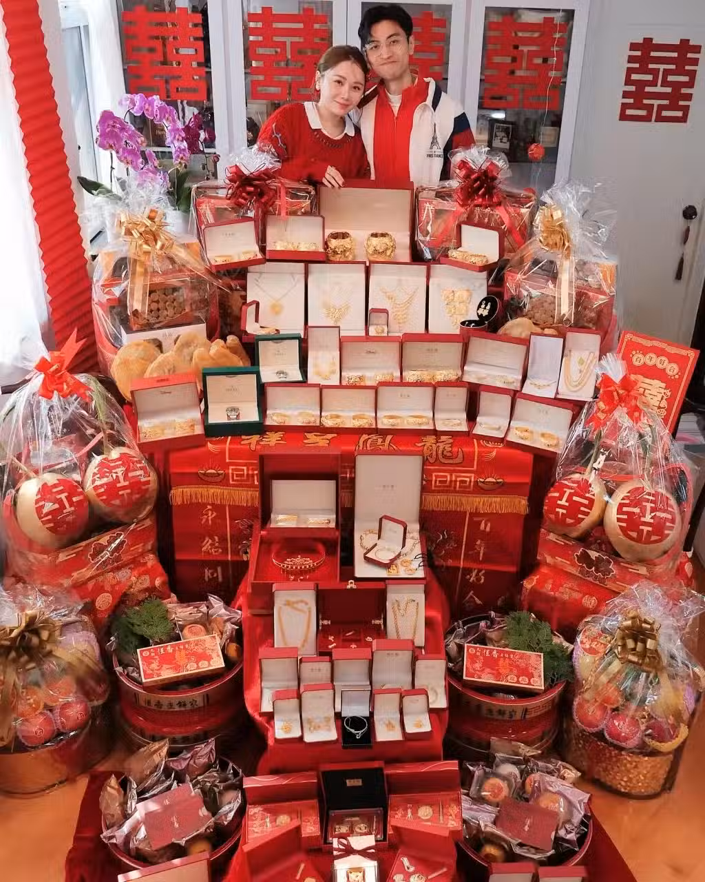 早前譚杏藍過大禮非常大陣仗,單單龍鳳鈪都有十幾對,其餘大大小小金器如金豬牌、項鍊等鋪滿桌子,還有兩隻名表,海味、水果、禮餅、椰子等等幾乎堆到出門口,寸步難行,排場超級誇張。