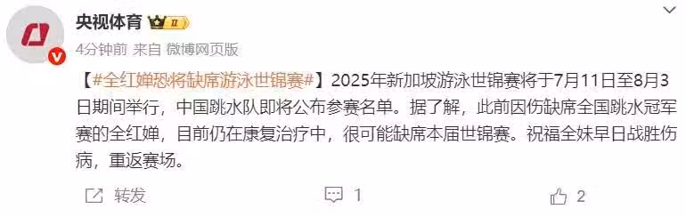 央視體育在報道中寫道:「2025年新加坡游泳世錦賽將於7月11日至8月3日期間舉行,中國跳水隊即將公布參賽名單。據了解,此前因傷缺席全國跳水冠軍賽的全紅嬋,目前仍在康復治療中,很可能缺席本屆世錦賽。祝福全妹早日戰勝傷病,重返賽場。 」