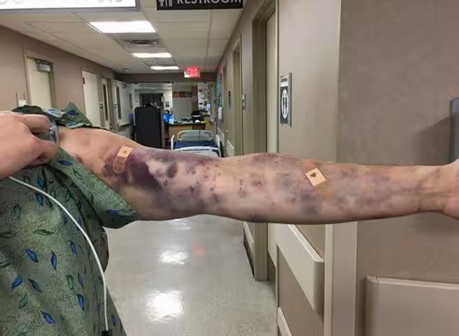 才過沒幾小時,他的手臂竟然出現一塊一塊的瘀青,而且疼痛到無法忍受!傑伊的老婆在擔憂之下,馬上送他到醫院治療,沒想到醫生檢查後竟然查不出病因,根本不知道他是被什麼蟲咬傷,也不知道為什麼會出現這樣的症狀!