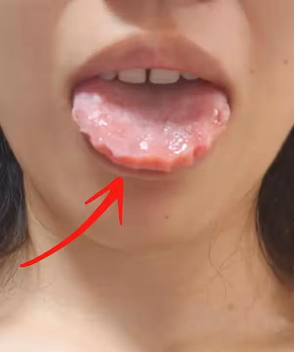 照片中,她的舌頭兩側布滿了深淺不一的凹陷,如同鋸齒般參差不齊,舌苔呈現不正常的黃褐色。