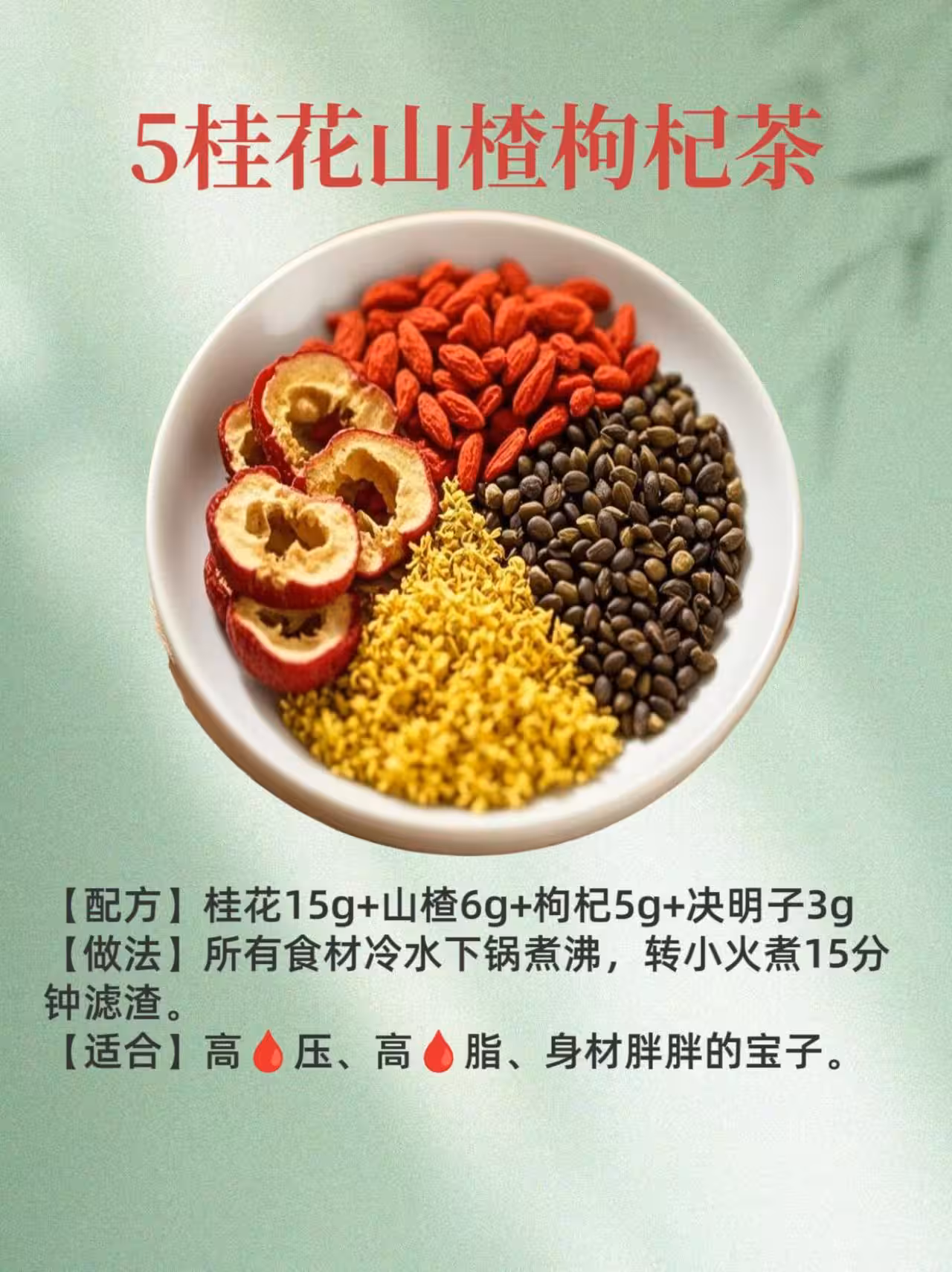 🍎桂花山楂枸杞茶:三/高、身材胖胖的寶子,試試這款茶。桂花、山楂、枸杞、決明子冷水下鍋煮沸,轉小火煮15分鐘濾渣,↓三.高又變瘦,一舉兩得💪