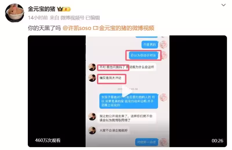 換言之,許凱承認自己確實動手。至於動手的原因,大金在直播中透露,居然是因為許凱夢到自己出軌,實在是太離譜。