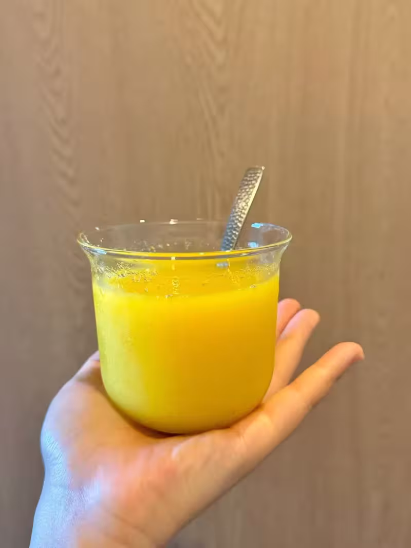 用到橙子半個、檸檬兩片、純椰子水一杯、麥片少許、薑黃粉和黑胡椒粉各一點點。
