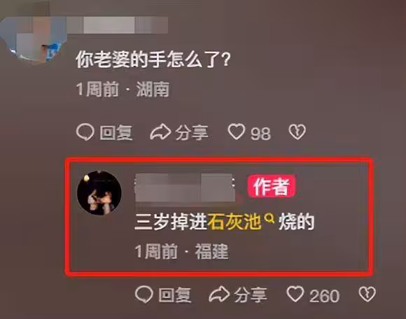 有人發現甜妹的雙手似乎都有殘障,就詢問丈夫到底怎麼回事,隨後博主就在評論區回復,表示妻子的雙手是在三歲的時候不小心掉進石灰池裡燒壞的。
