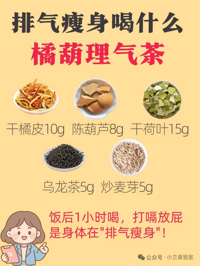 功效:橘皮+陳葫蘆破氣消積,炒麥芽助消化。飯後1小時喝,打嗝放屁是身體在"排氣瘦身"!