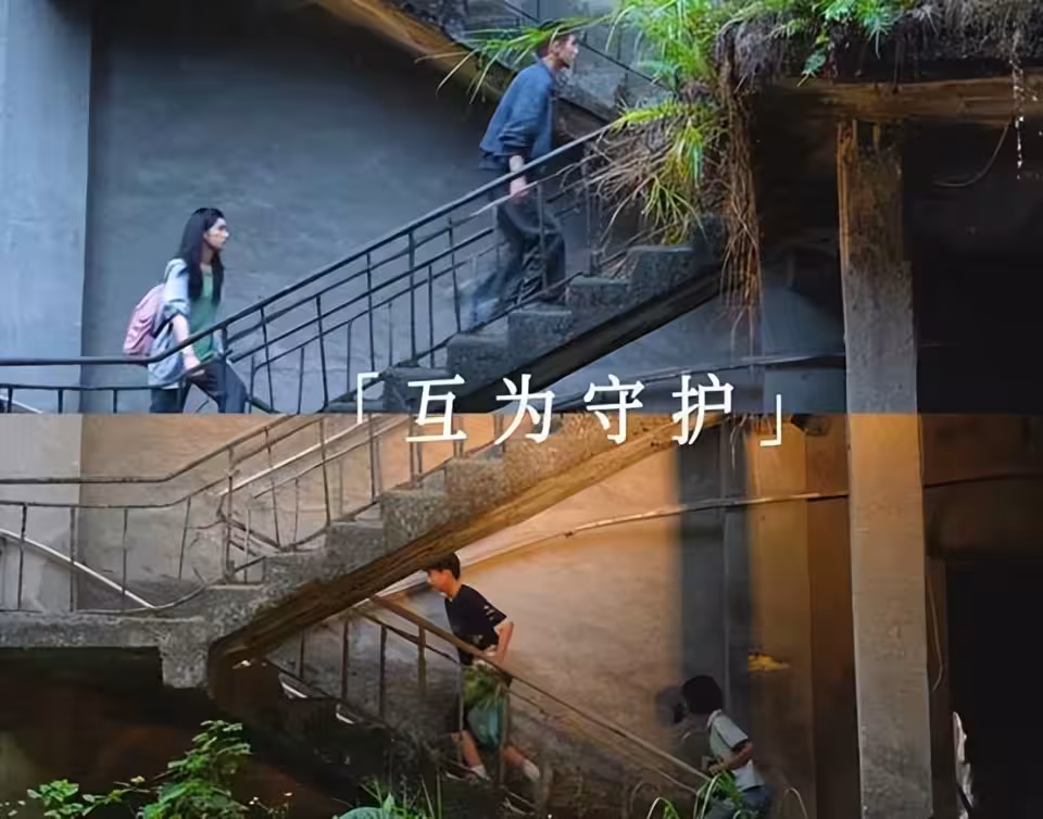堆放廢棄建材的工地、泥濘不堪的路面,推著摩托車的工裝青年和亦步亦趨的少女。