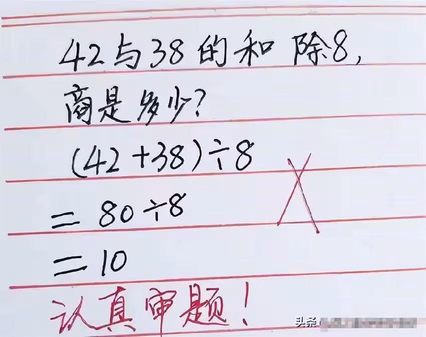 國小生數學題,「(42+38)÷8=10」被打叉,家長質問老師「反被打臉」:好好審題