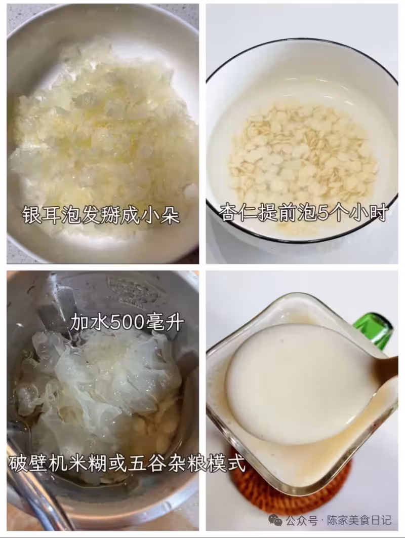 甜杏仁、銀耳適量、冰糖適量、清水500毫升