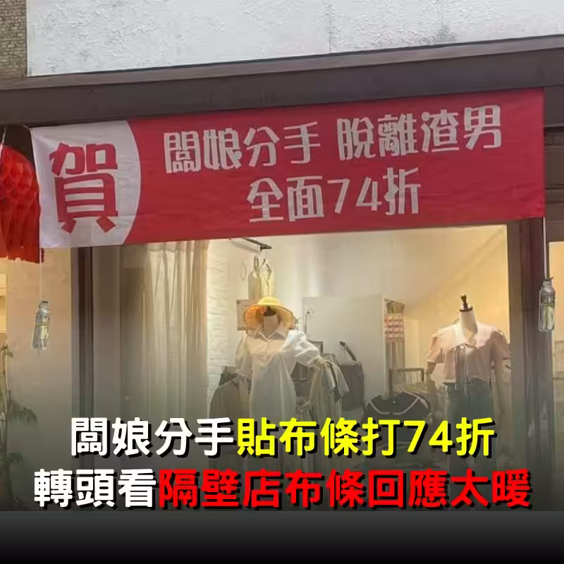 老闆娘分手!氣憤貼布條「脫離渣男」全面打折 瞄向隔壁「跟著掛布條回應」網笑翻:感情真好~