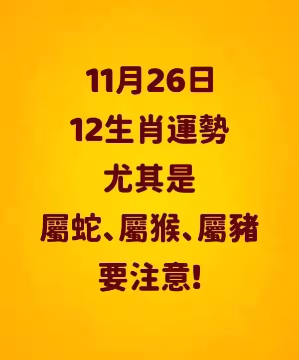 11月26日12生肖運勢 尤其是屬蛇、屬猴、屬豬要注意