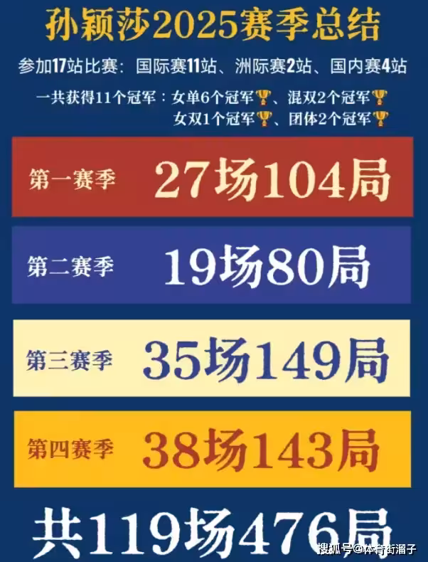 孫穎莎在這一年的時間裡,總共出戰了119場比賽,打了476局的比賽,拿到了6個女單冠軍,2個混雙冠軍,2個團體冠軍還有一個女雙冠軍,這真的是全年無休啊,每一個成績都是用自己的汗水換來的。這其中她出戰的包括了11站國際比賽,2站洲際賽,除了比賽的辛苦之外,連續的來回奔波,對她也是一種消耗。