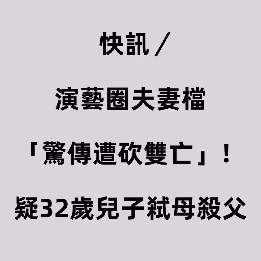 快訊/演藝圈夫妻檔 「驚傳遭砍雙亡」!疑32歲兒子弒母殺父