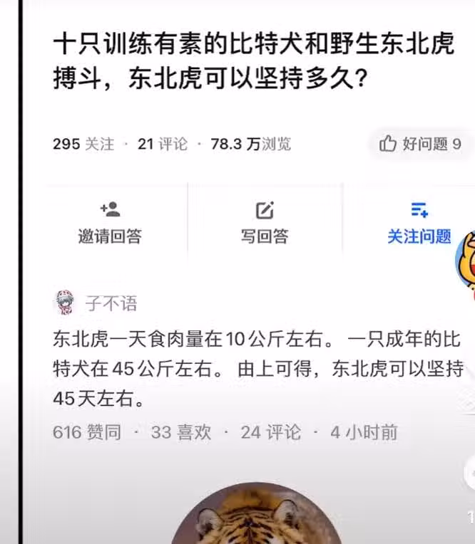 所以,老虎和比特犬的比拼,勝利是一定的,至於能堅持多長時間,這個回答很有意思:這十隻夠老虎吃45天,在之後就要餓肚子了。