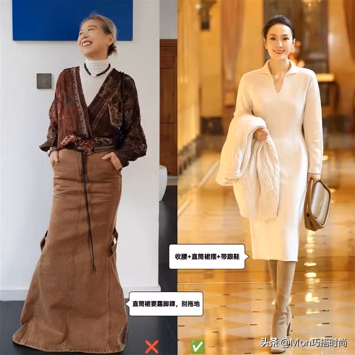 直筒裙也是女人老後的不二之選。利落的版型+質感材質是優雅的王牌組合,配針織衫、襯衫、西裝都分外迷人。