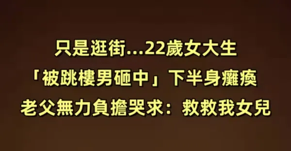 只是逛街…22歲女大生「被跳樓男砸中」下半身癱瘓 老父無力負擔哭求:救救我女兒