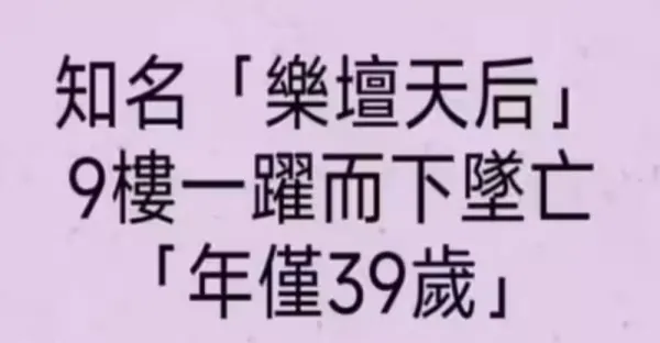 知名「樂壇天后」 9樓躍下墜亡 「享年39歲」