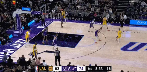 克拉克森追著東契奇和萊恩打,這哥倆的橫移速度都跟不上對手。場上風雲突變:爵士轟出一波17比2,湖人瞬間落後20分。這可是西部倒數第二啊!東契奇第三節打了8分鐘,單節被吹5次犯規!三節打完,爵士104比86領先18分。