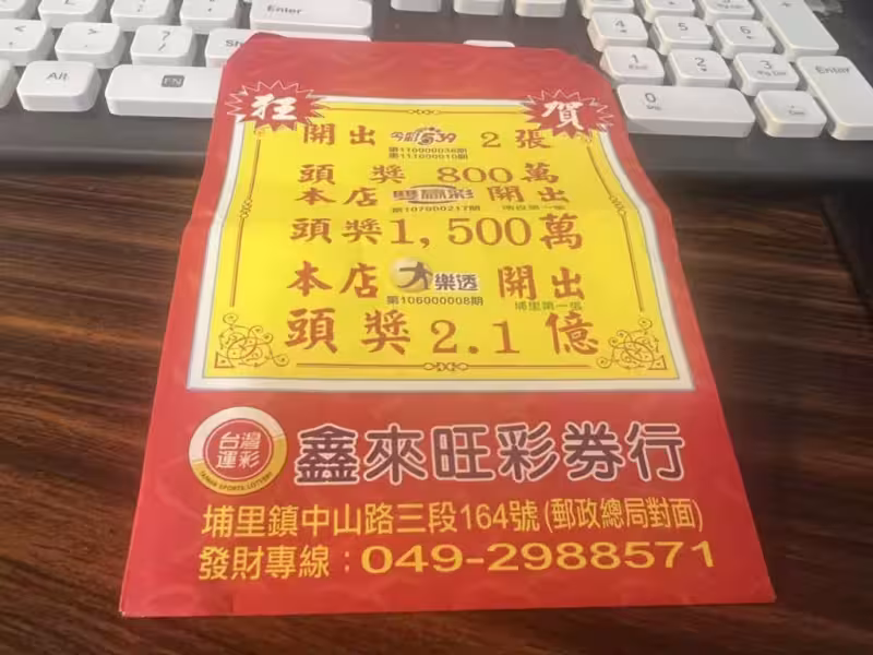 台灣彩券公司董事長黃志宜近日分享,位在南投縣埔里鎮中山路「鑫來旺彩券行」是全台唯一,開出過包含威力彩、大樂透、今彩539及大福彩頭獎的彩券行,由於大福彩已經下市,因此其他彩券行都已無法完成大滿貫成就,難以望其項背。